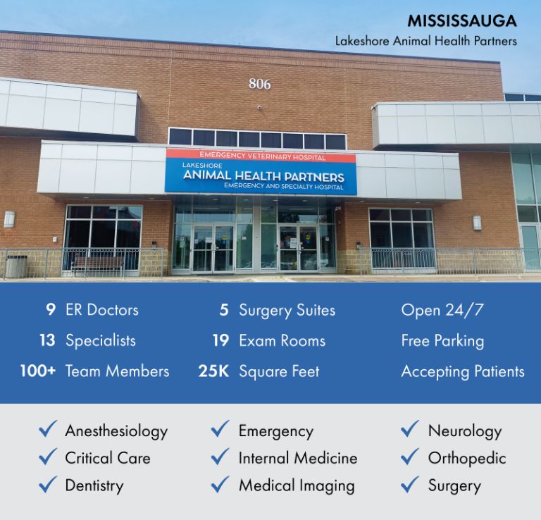 Lakeshore Animal Health Partners, our second location in Mississauga, also offers emergency veterinary and specialty services to cats and dogs in the west part of the city and surrounding areas.