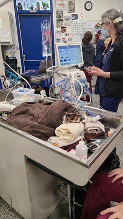 Mechanical ventilation does not cure the lungs or weakened respiratory muscles, but it does support lung function to allow time to treat the underlying problem. Mechanical ventilation requires intensive care and continuous monitoring. For this reason, AHP veterinarians and intensive care unit technicians are at the bedside of any patient on the ventilator 24 hours per day.